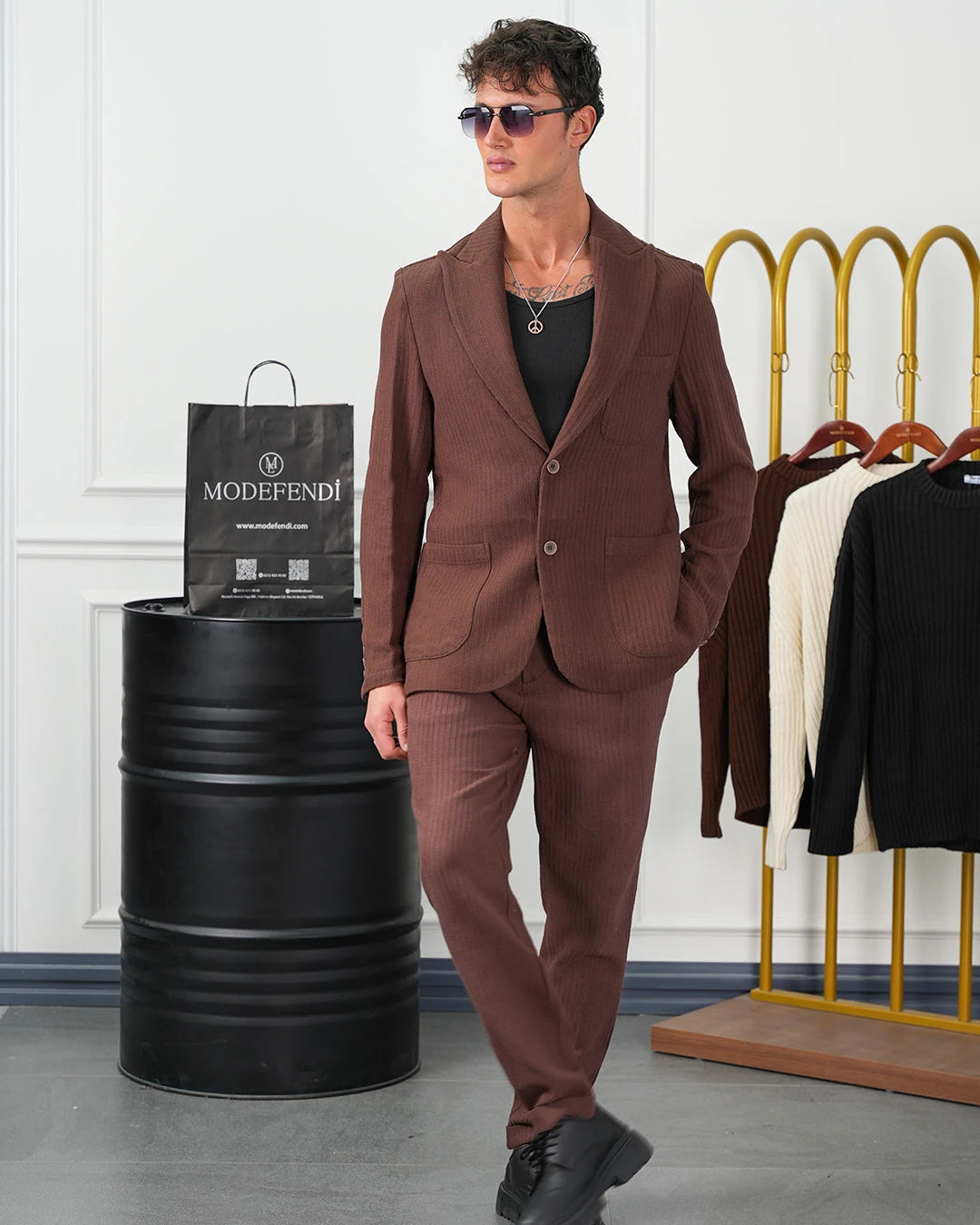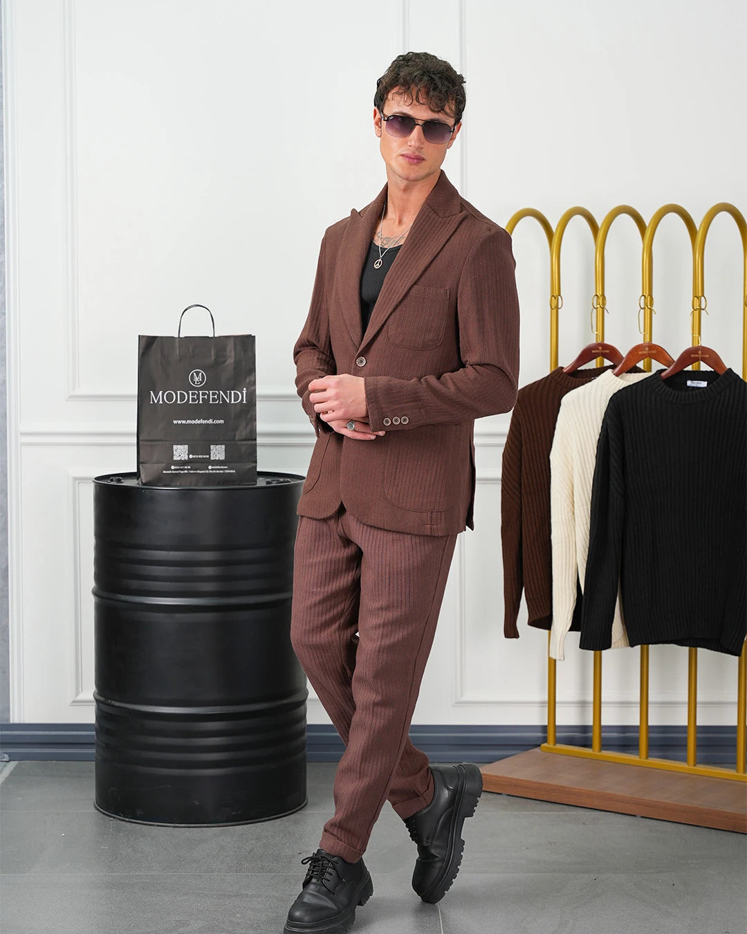 %100 Pamuk Keten Modern Fit Örgü Kemer Detaylı Keten Takım Elbise
