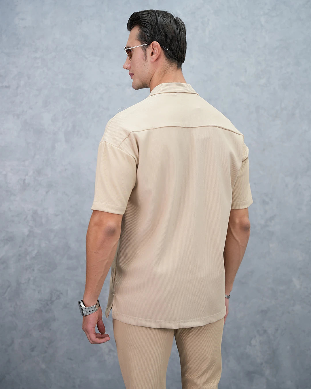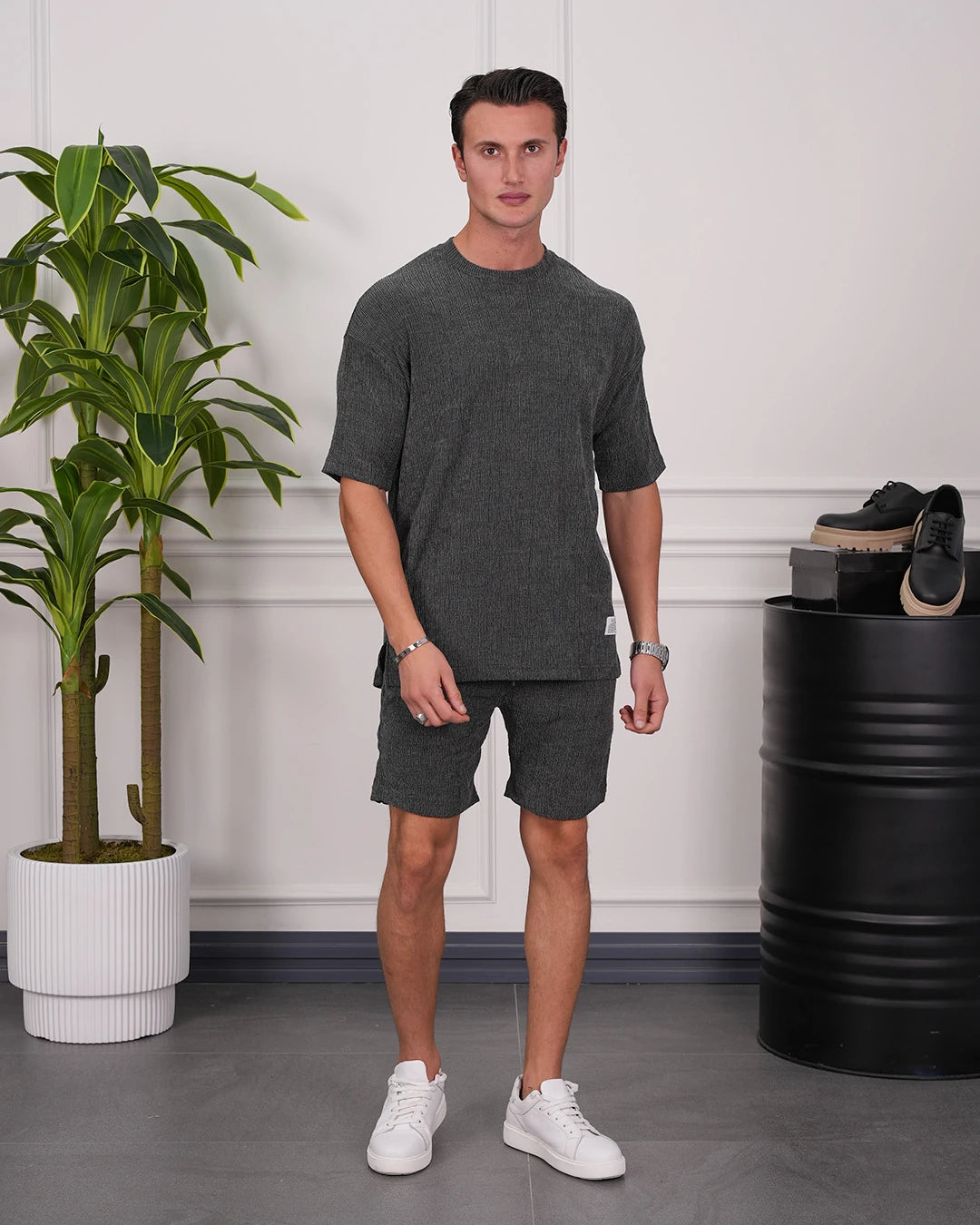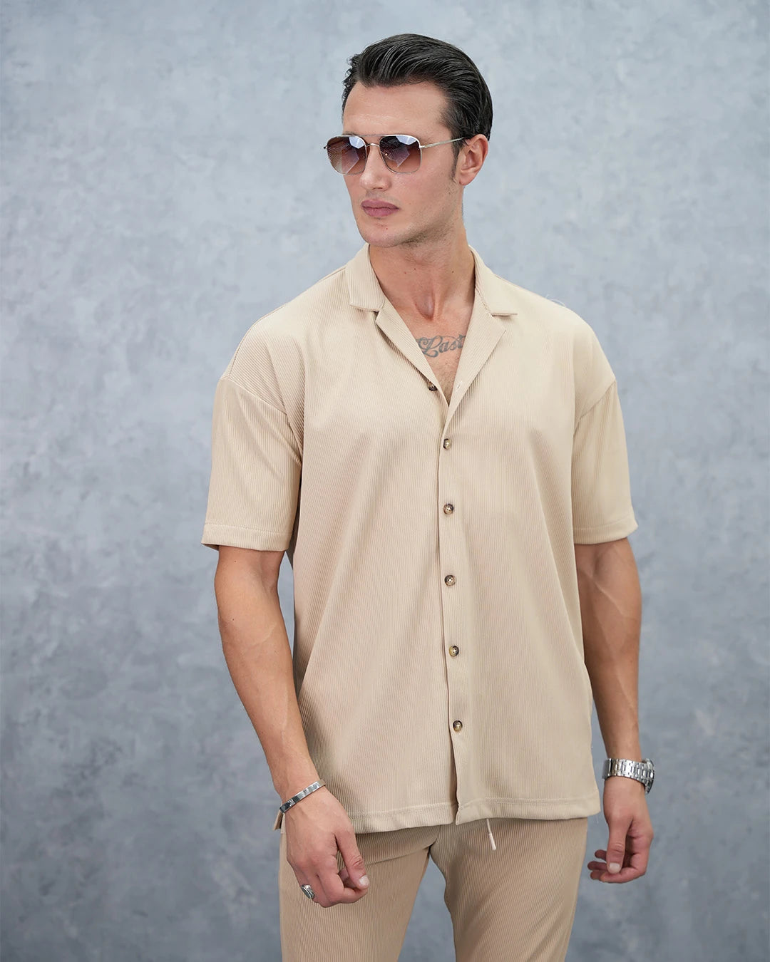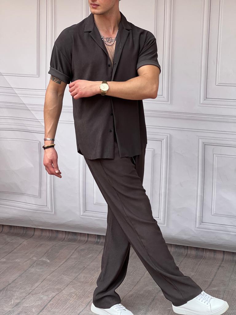 Fitil Desenli Oversize Kısa Kollu Gömlekli Takım
