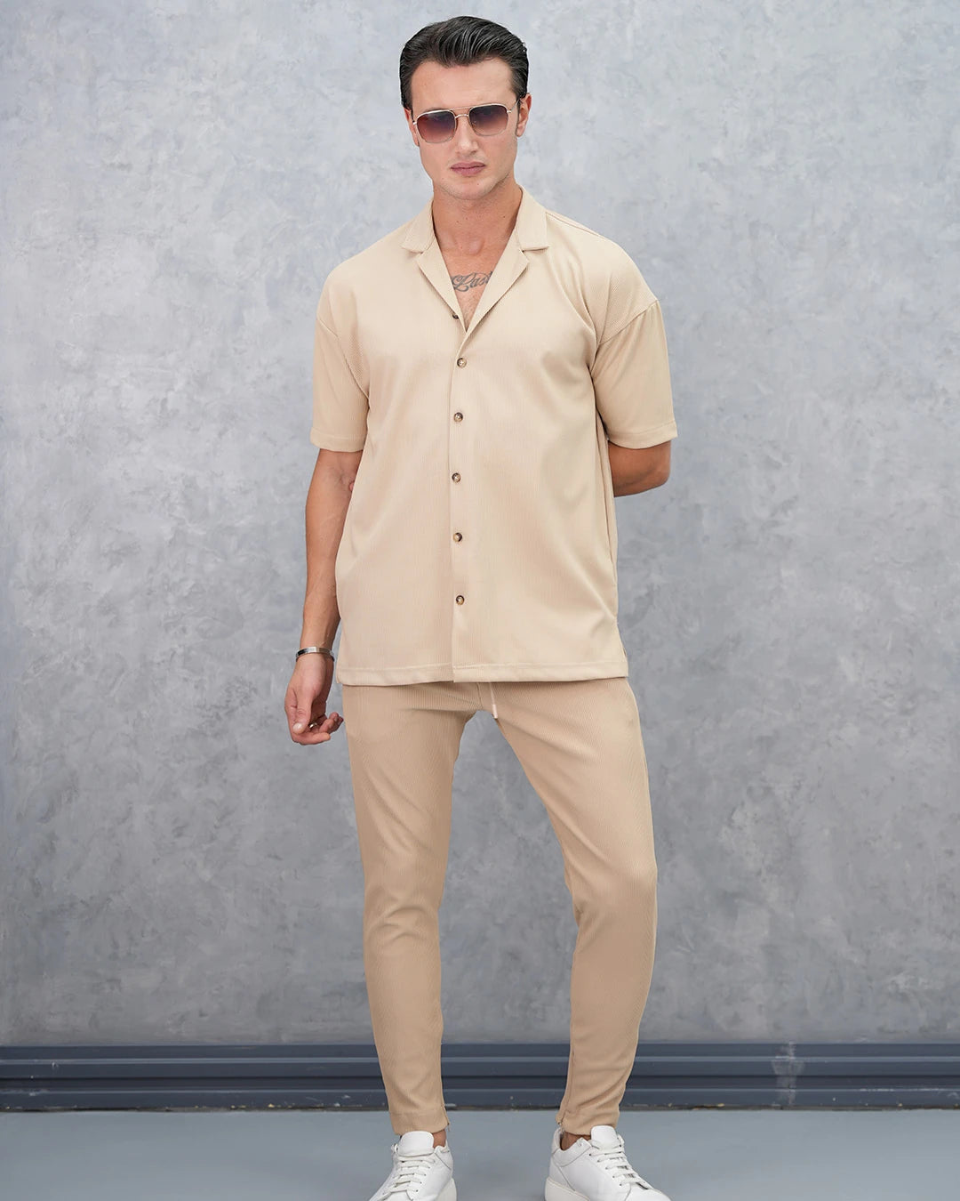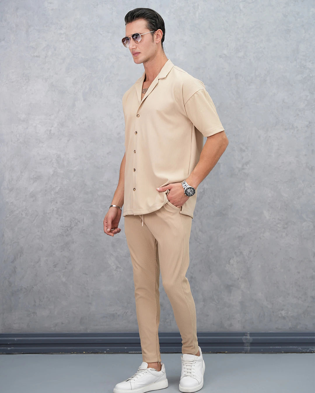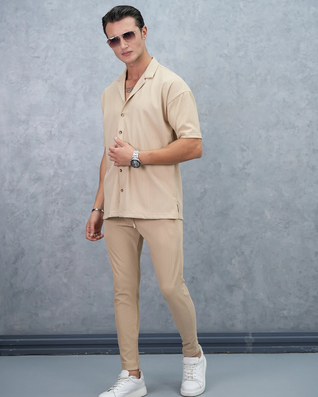 Fitil Desenli Oversize Kısa Kollu Gömlekli Takım