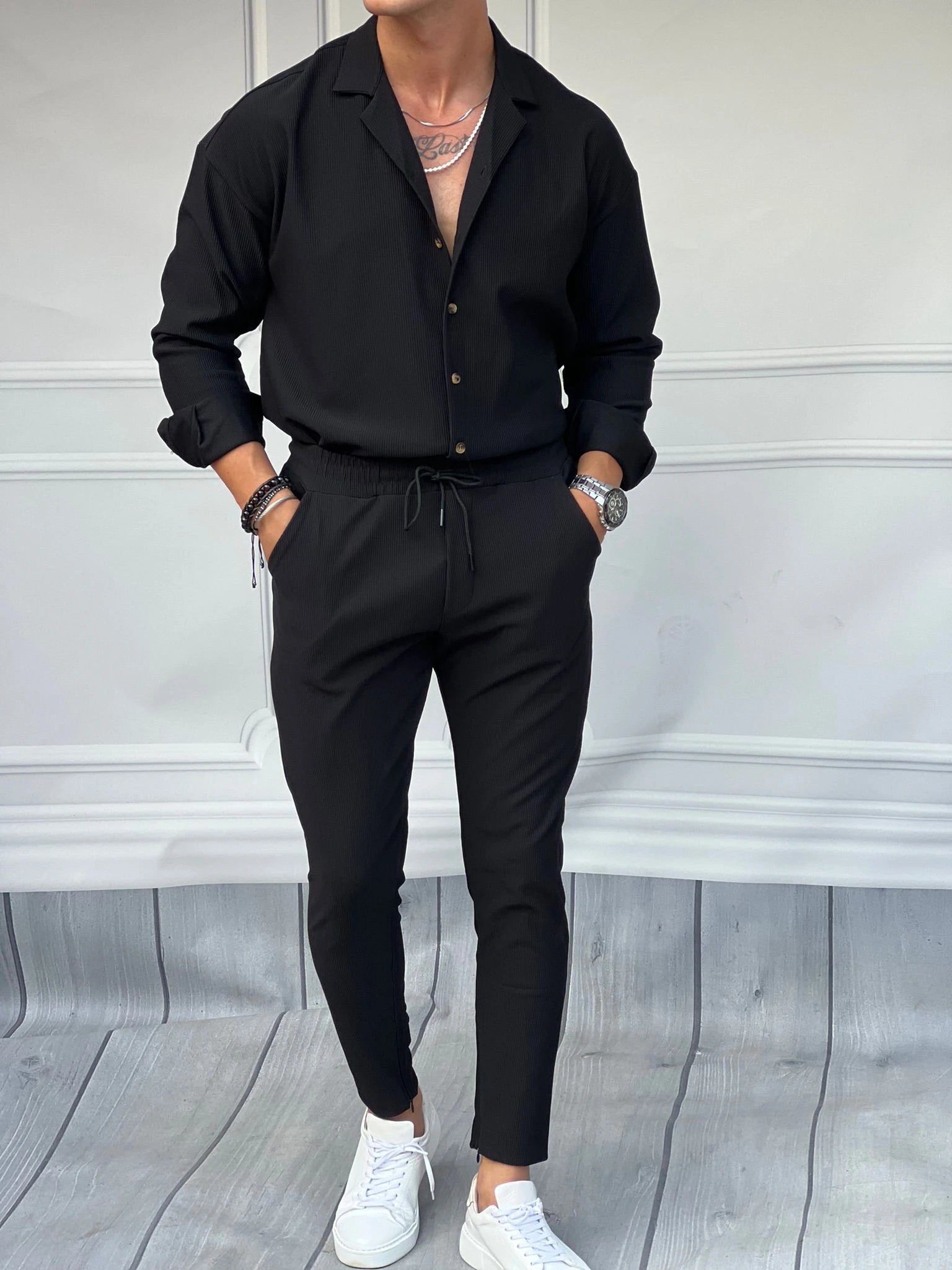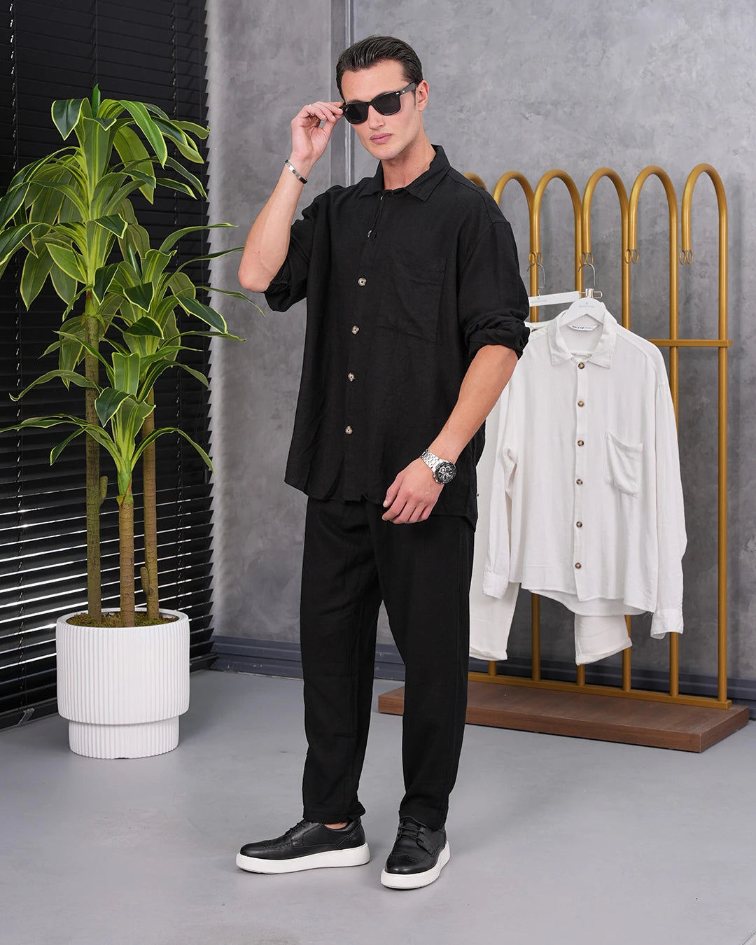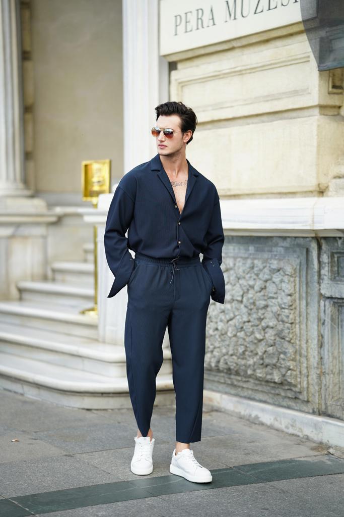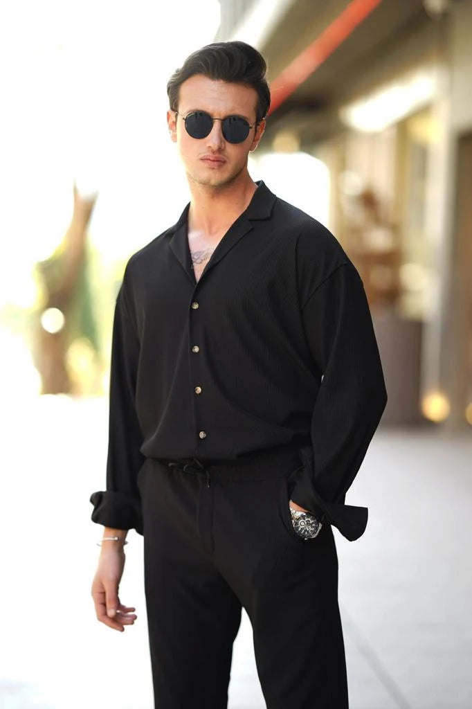 Fitil Desenli Oversize Uzunkol Gömlekli Takım