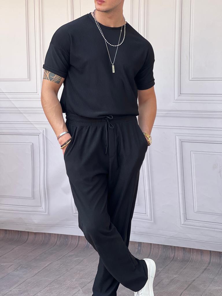 İnce Fitil Desenli Oversize Kalıp Tshirt'lü Alt Üst Takım