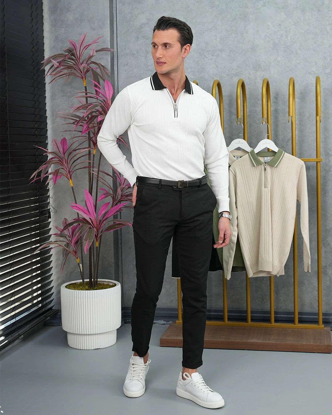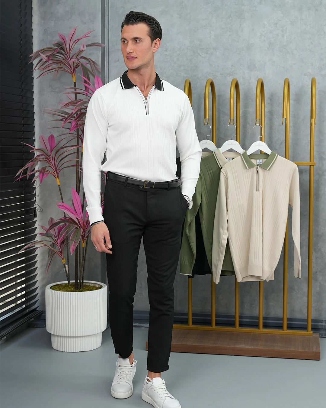 Pamuk Likra Slim Fit Yaka Çizgi Detaylı Fermuarlı Triko Kazak