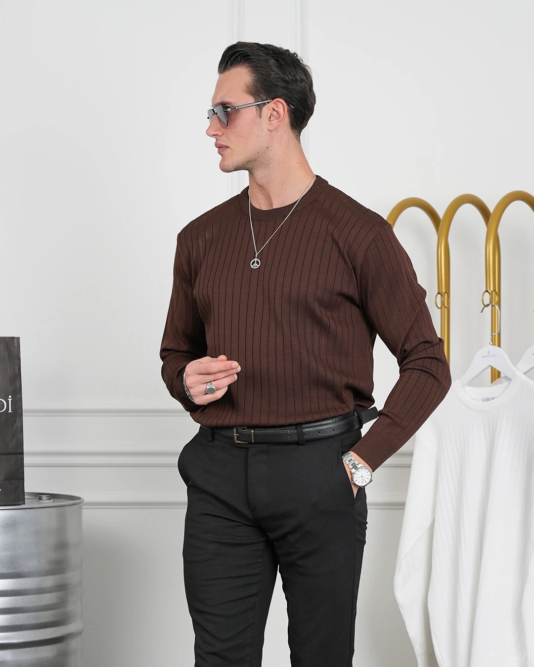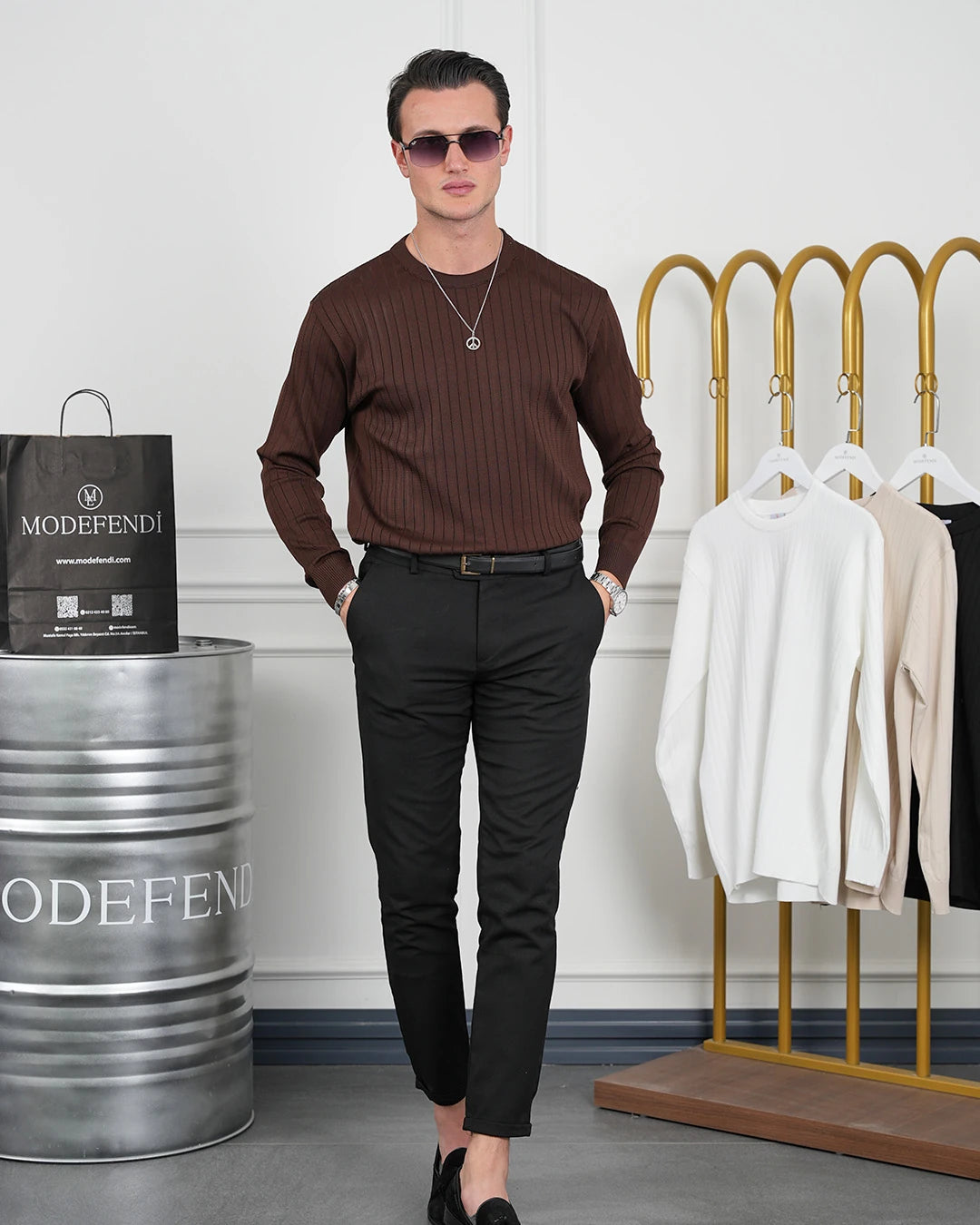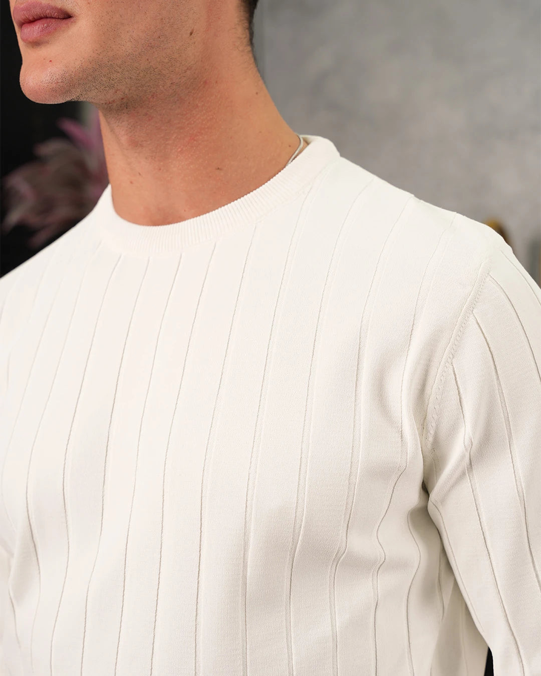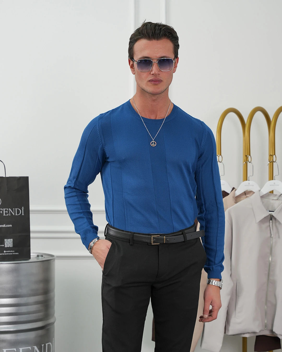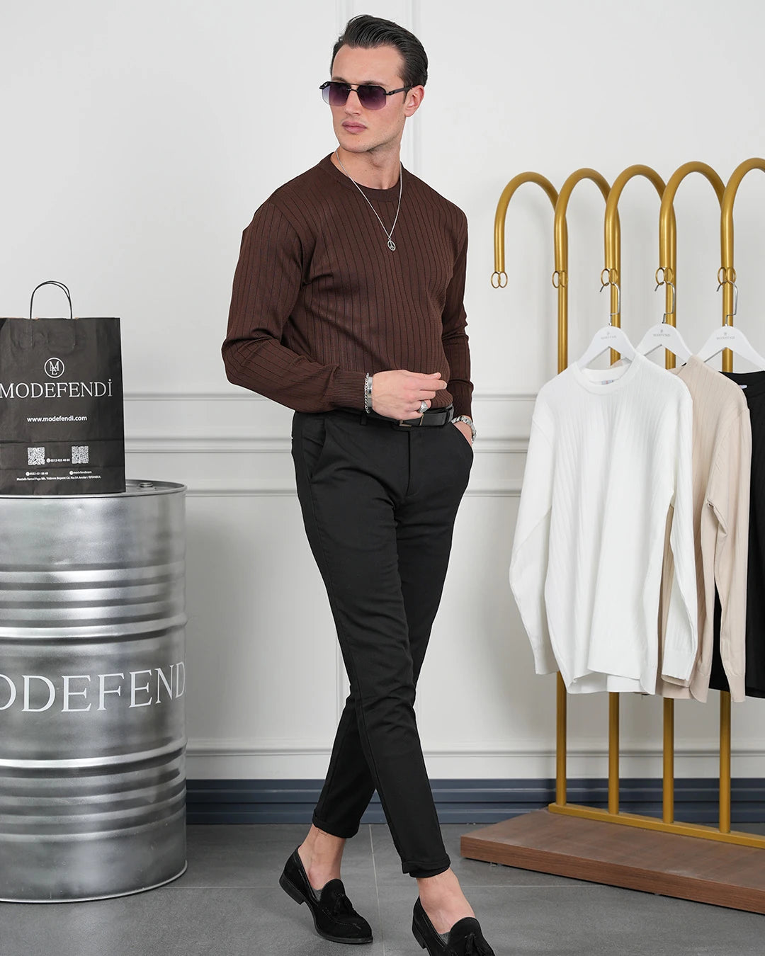 Pamuk Likra Slim Fit Bisiklet Yaka Dikey Çizgi Triko Kazak