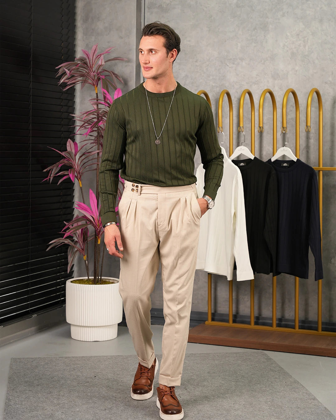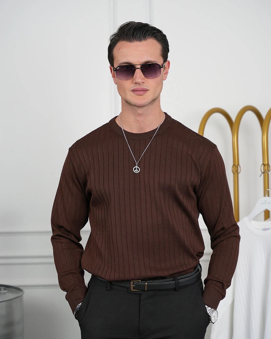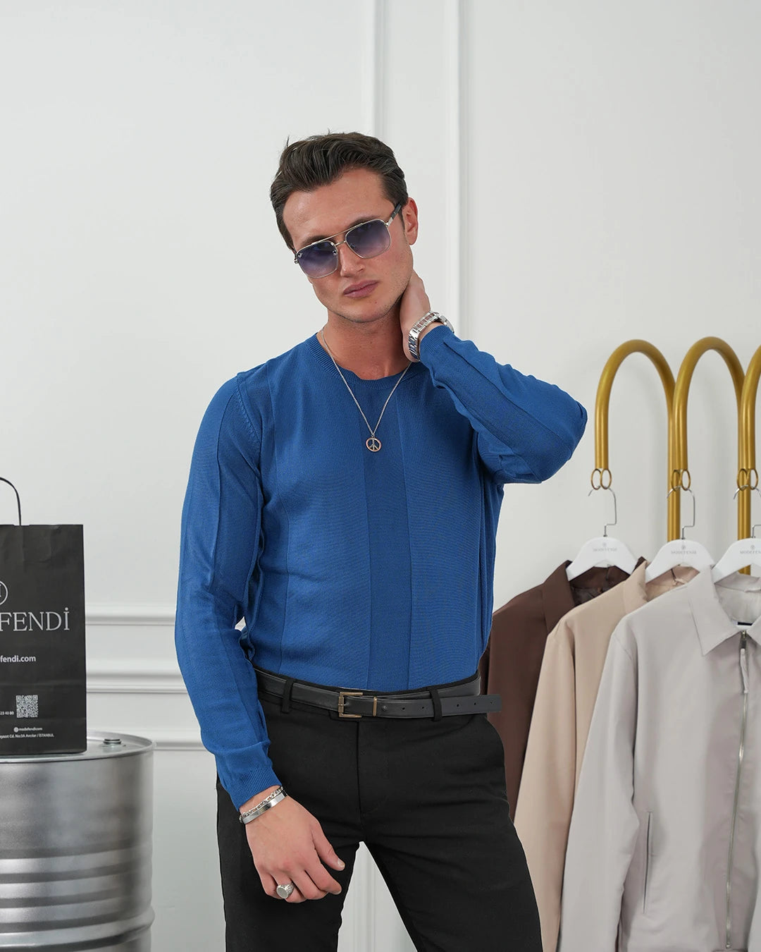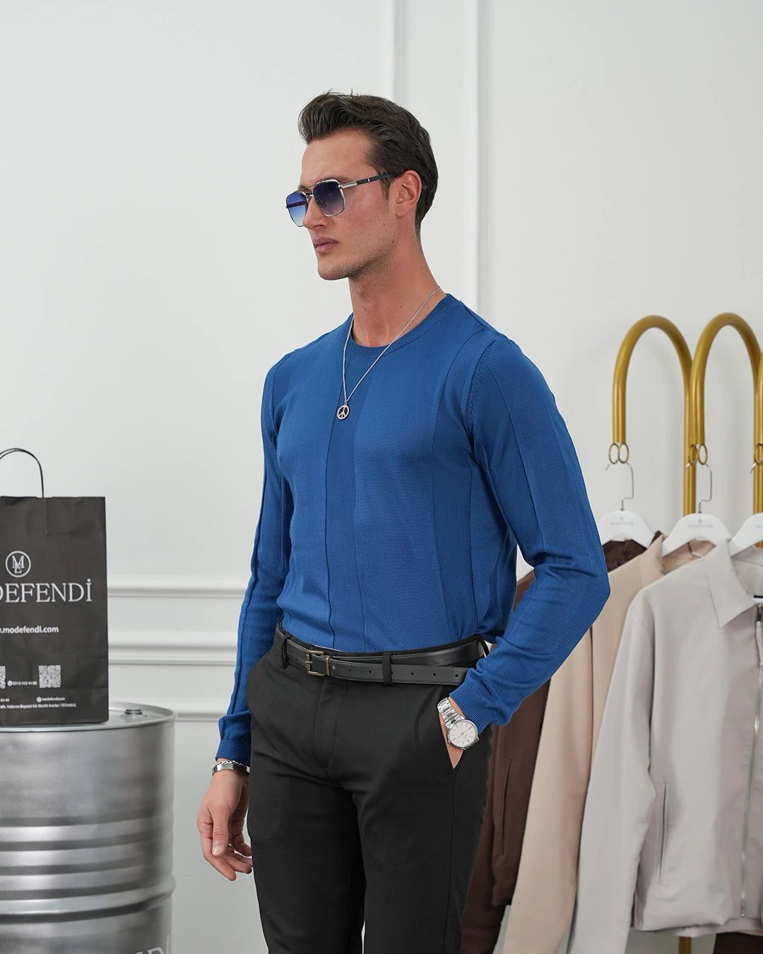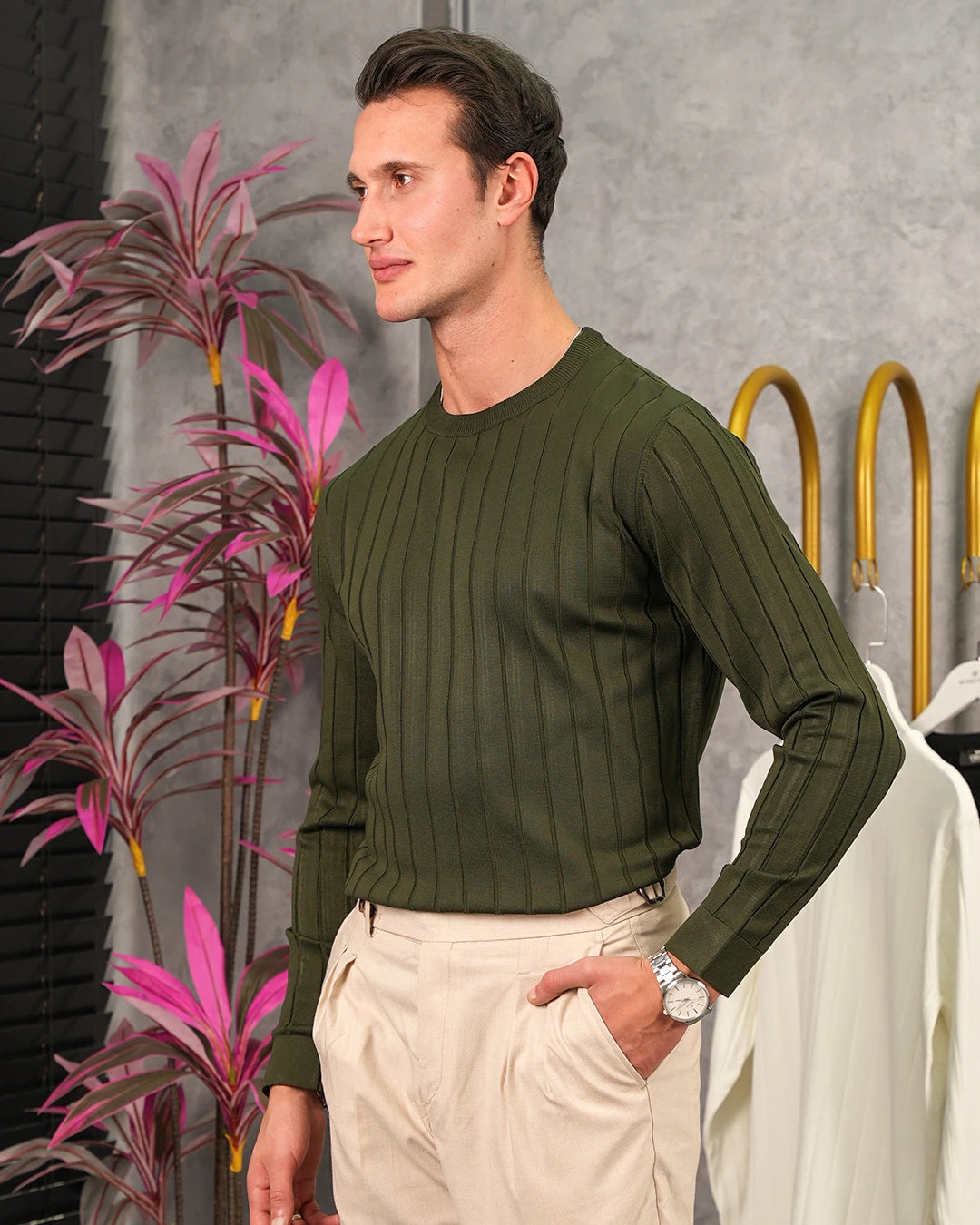 Pamuk Likra Slim Fit Bisiklet Yaka Dikey Çizgi Triko Kazak