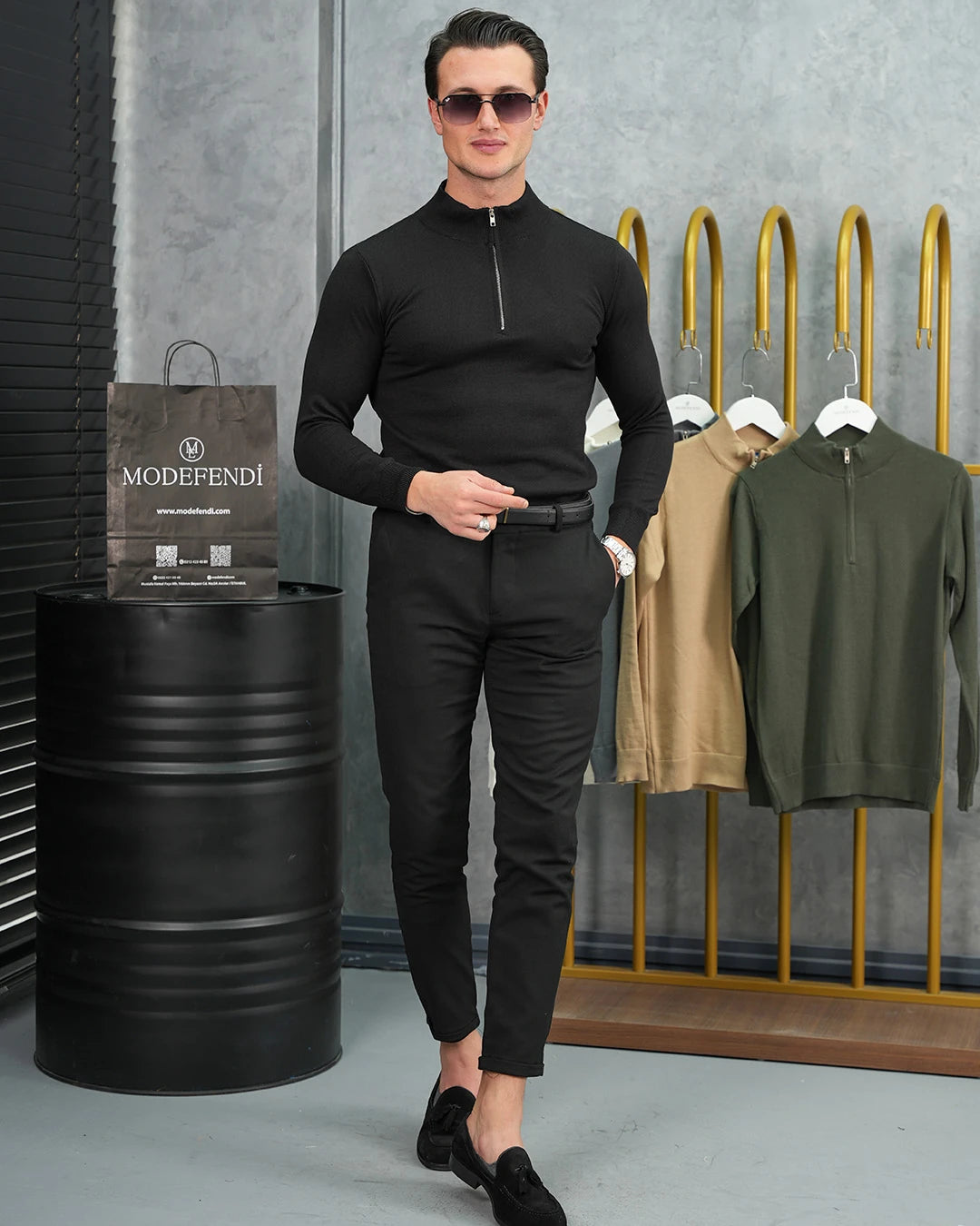 Pamuk Likra Slim Fit Kalıp Yaka Fermuar Detaylı Triko Kazak