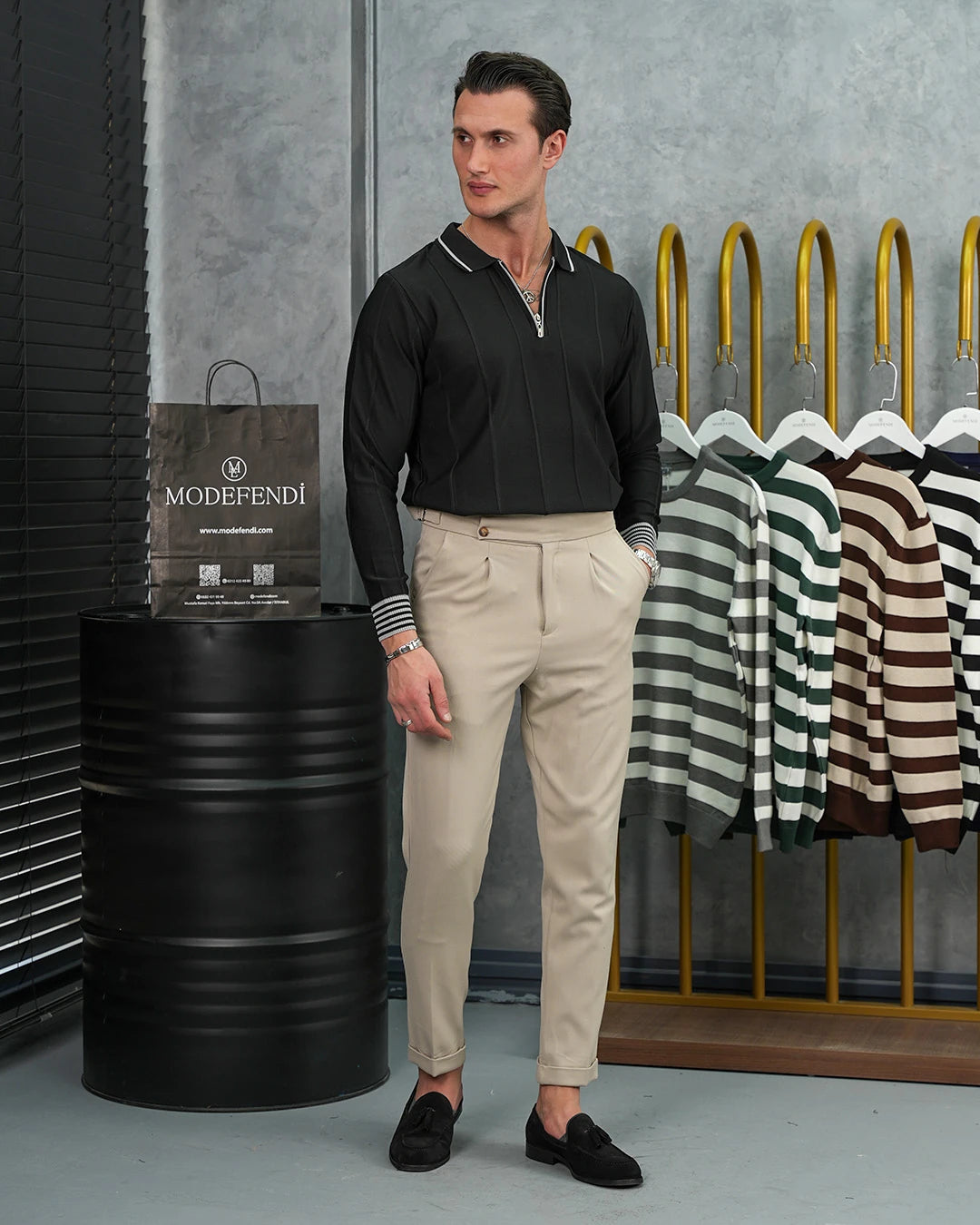 Pamuk Likra Yaka Şerit Detaylı İnce Fitil Fermuar Detaylı Triko Kazak
