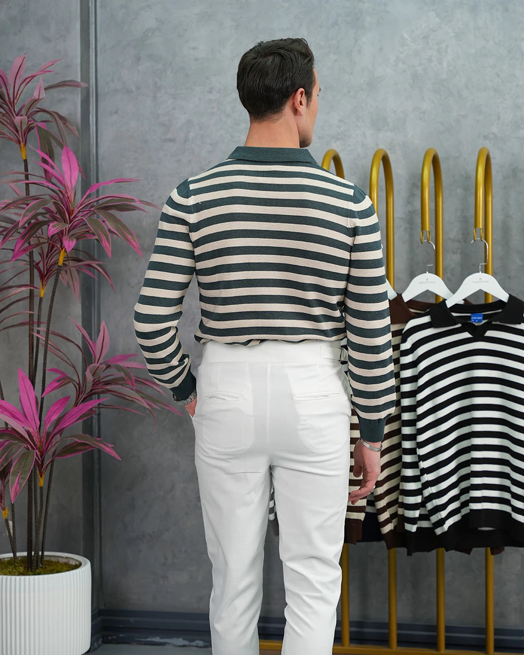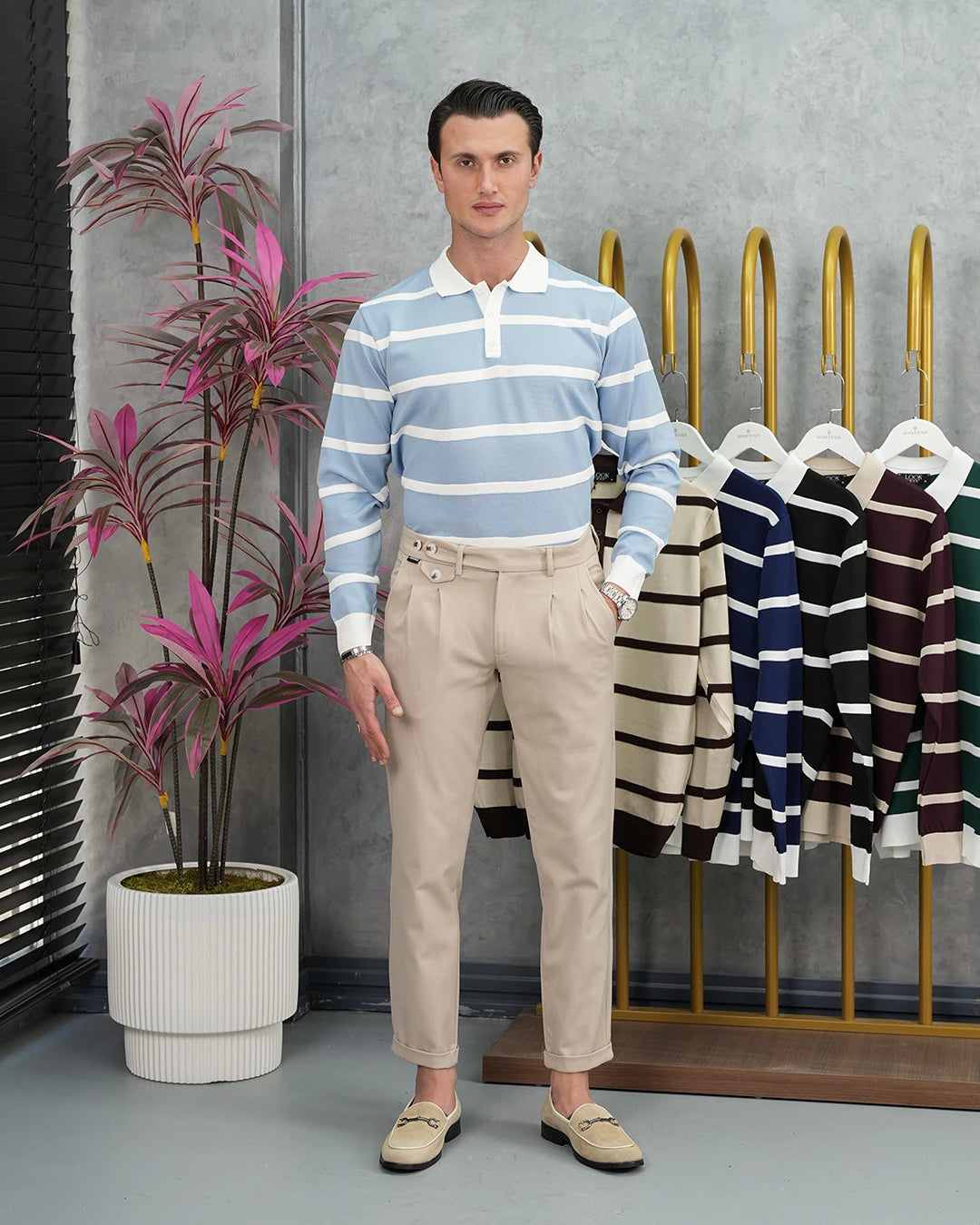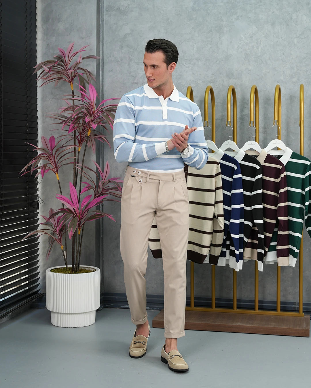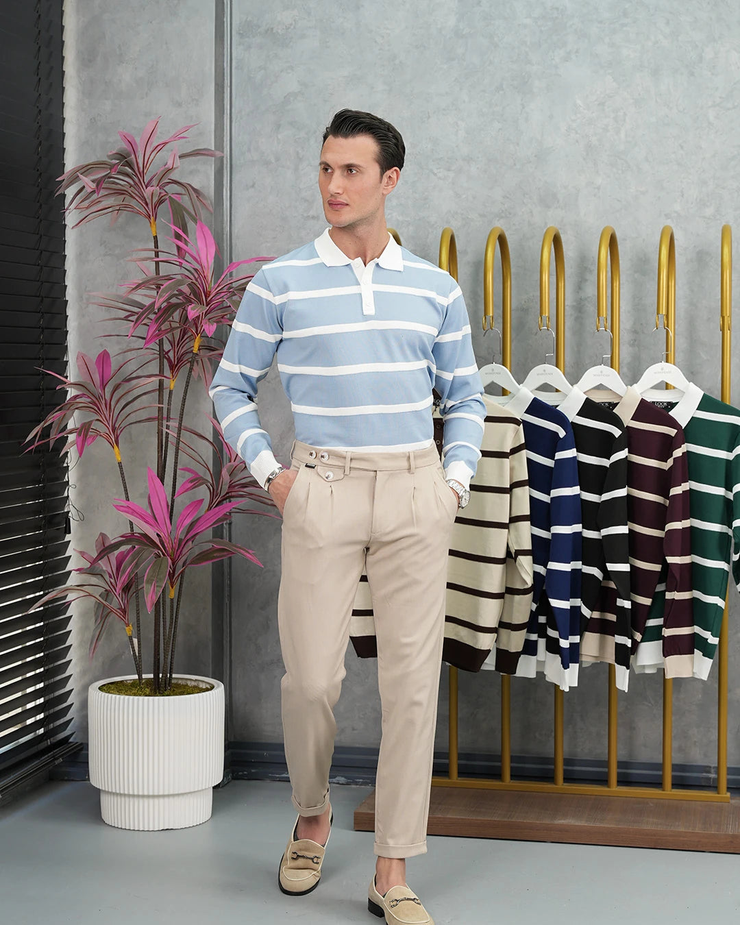 Pamuk Likra Slim Fit Polo Yaka Dikey Geniş Çizgi Triko Kazak