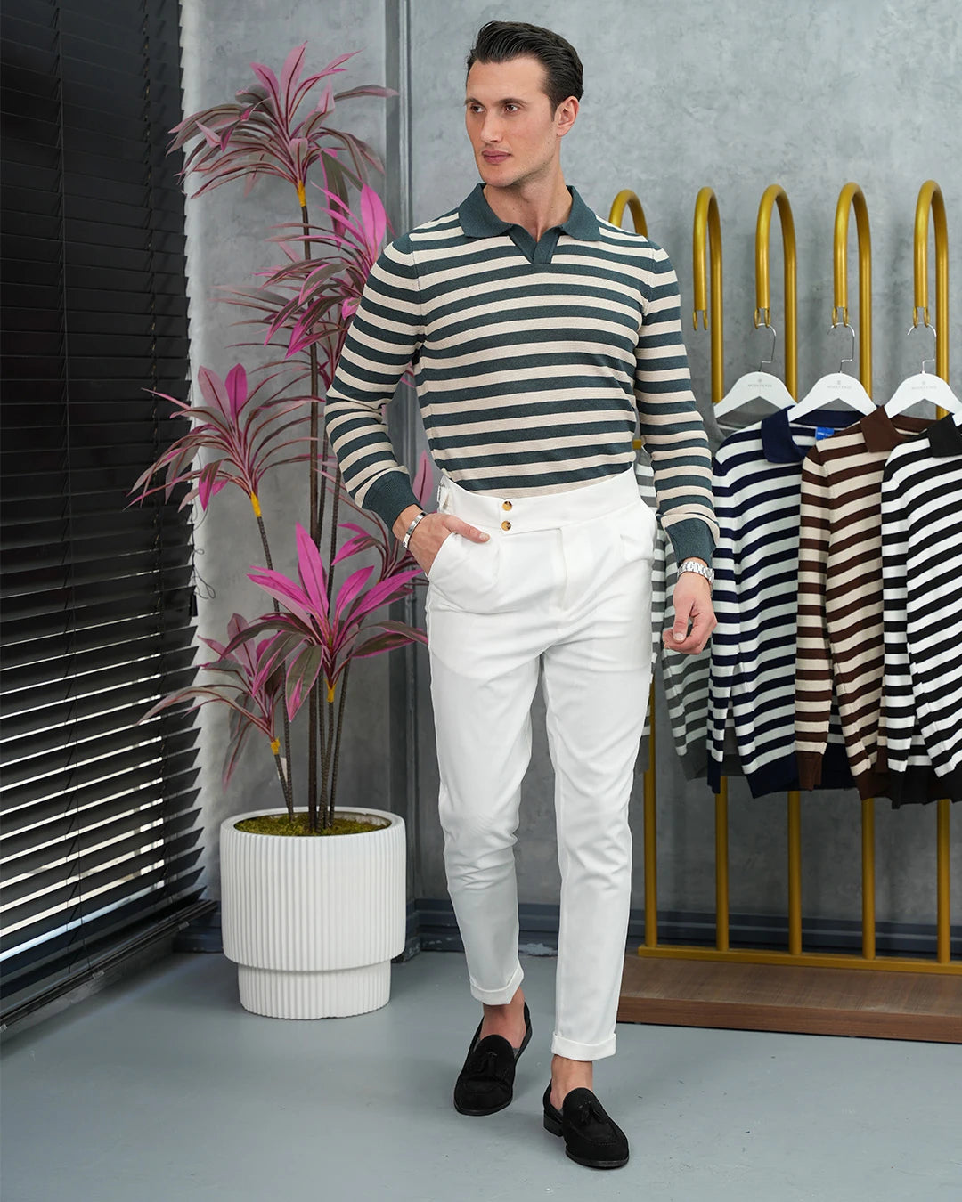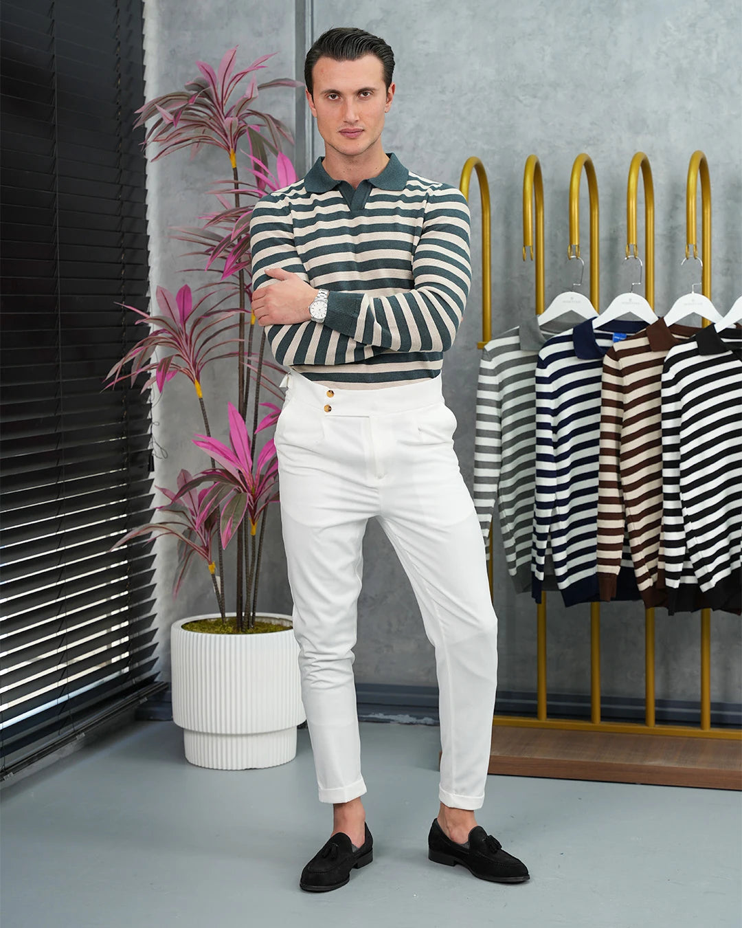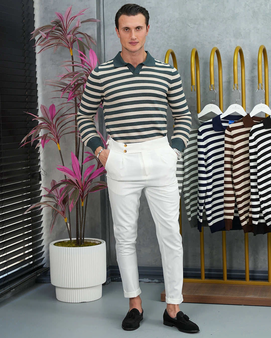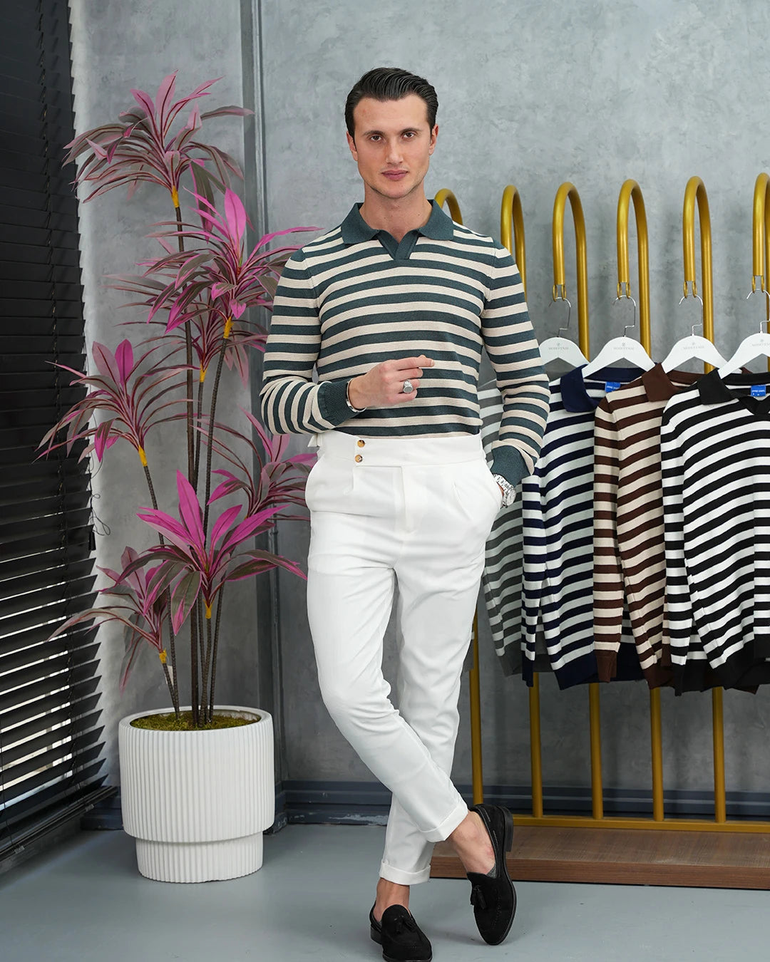 Pamuk Likra Slim Fit Polo Yaka Dikey Geniş Çizgi Triko Kazak