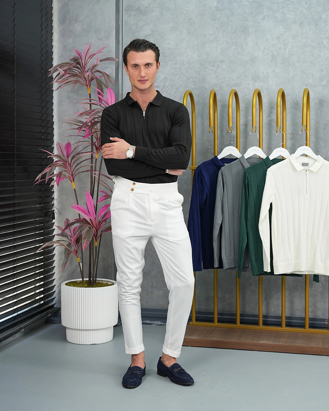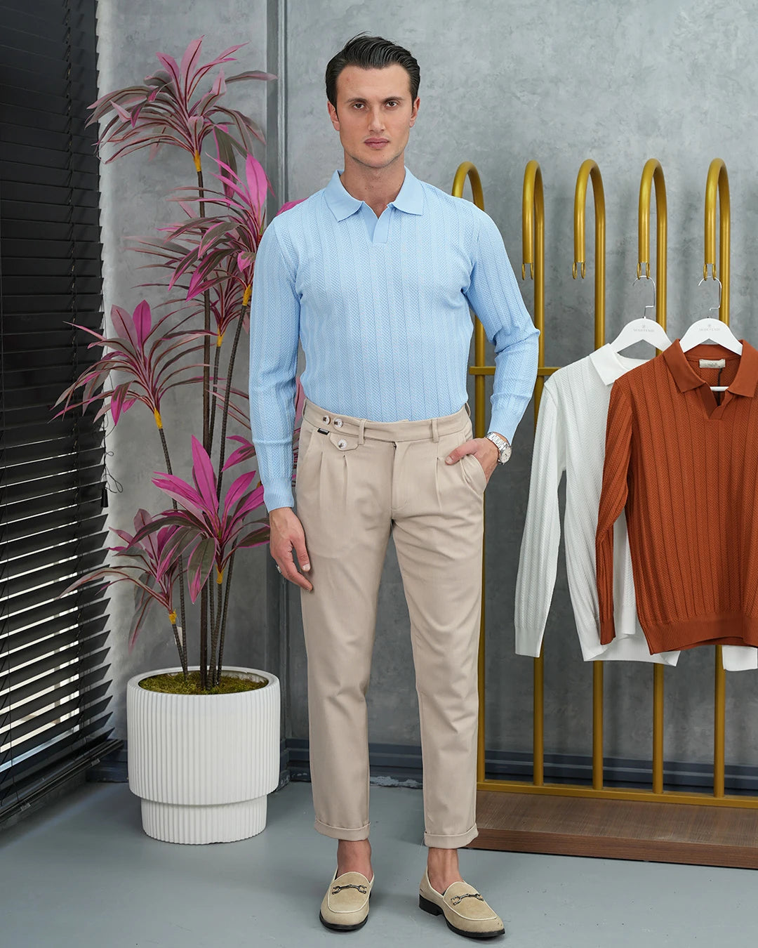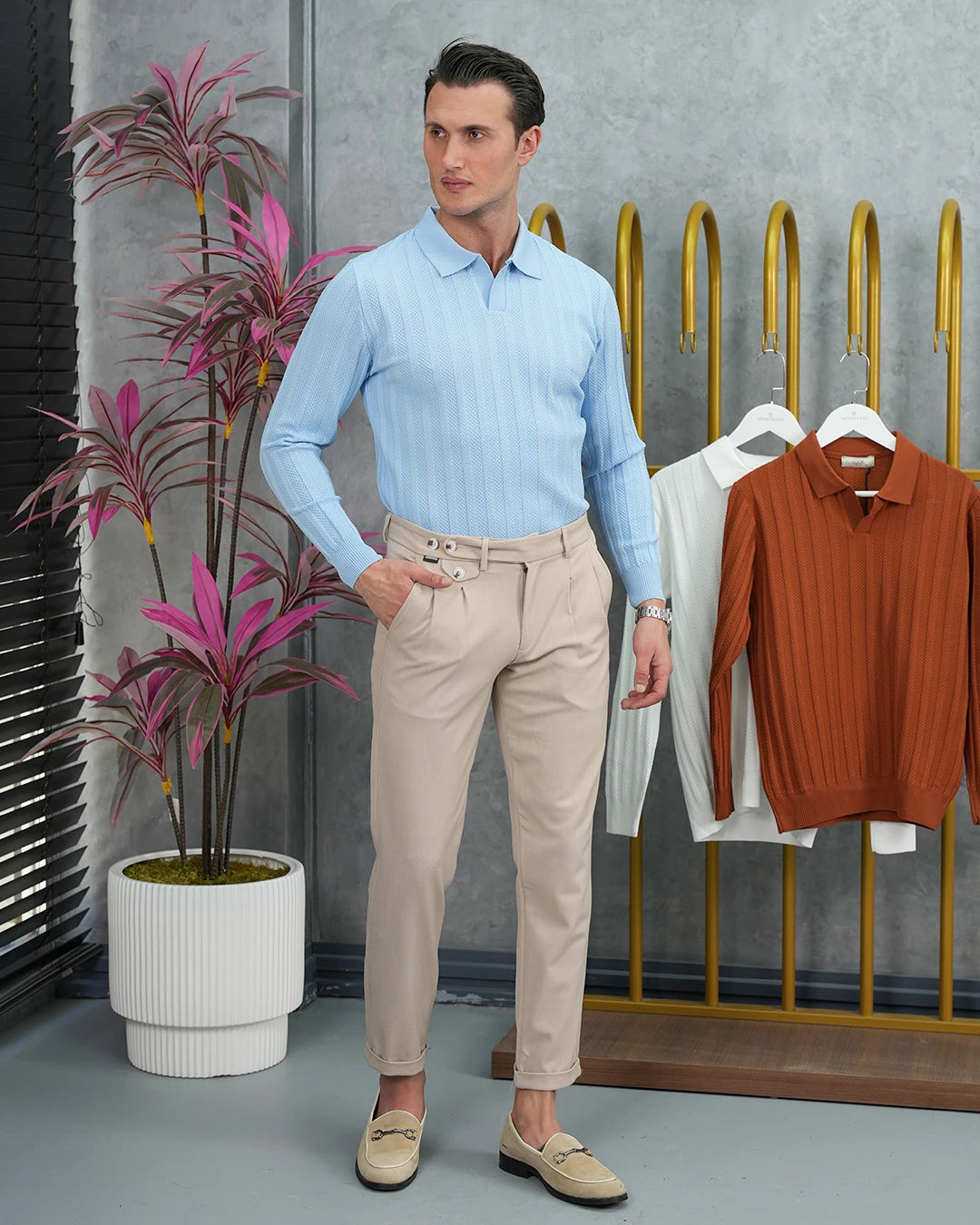 Pamuk Likra İnce Fitil Yaka Düğmeli Slim Fit Triko Kazak
