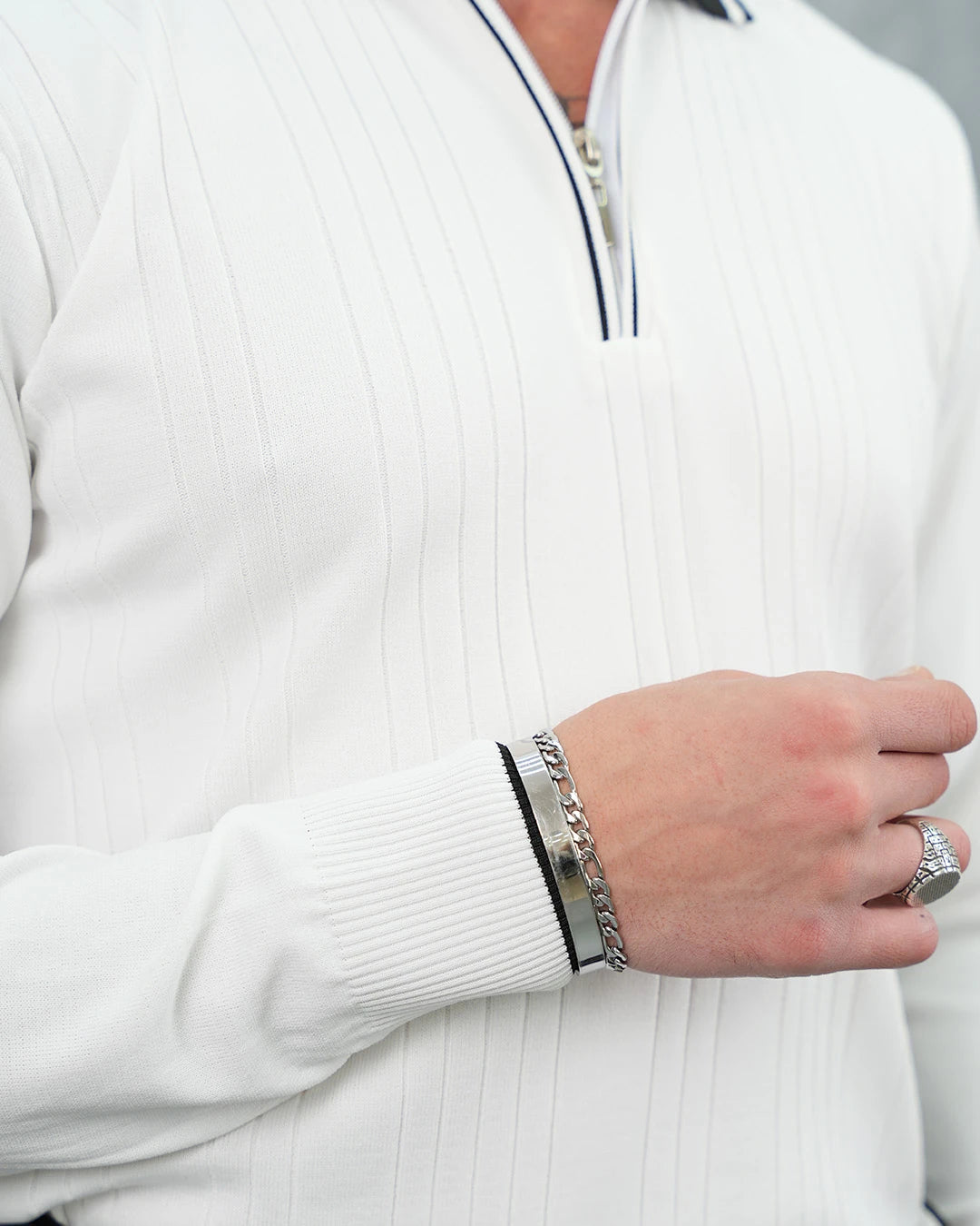 Pamuk Likra Slim Fit Bilek ve Yaka Çizgi Detaylı Yaka Fermuarlı Triko Kazak