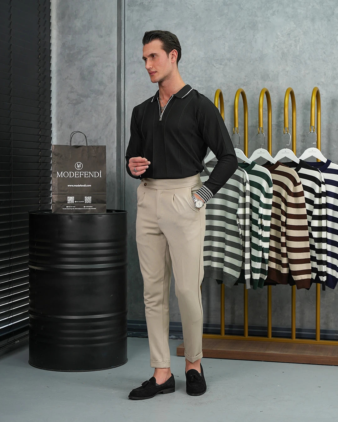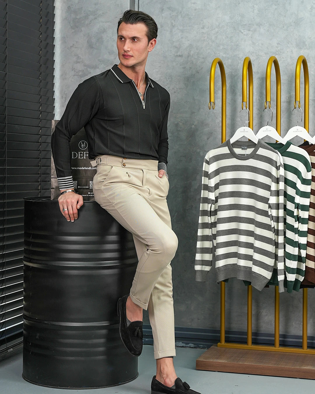 Pamuk Likra Slim Fit Geniş Dikey Desenli Fermuar Detaylı Kazak