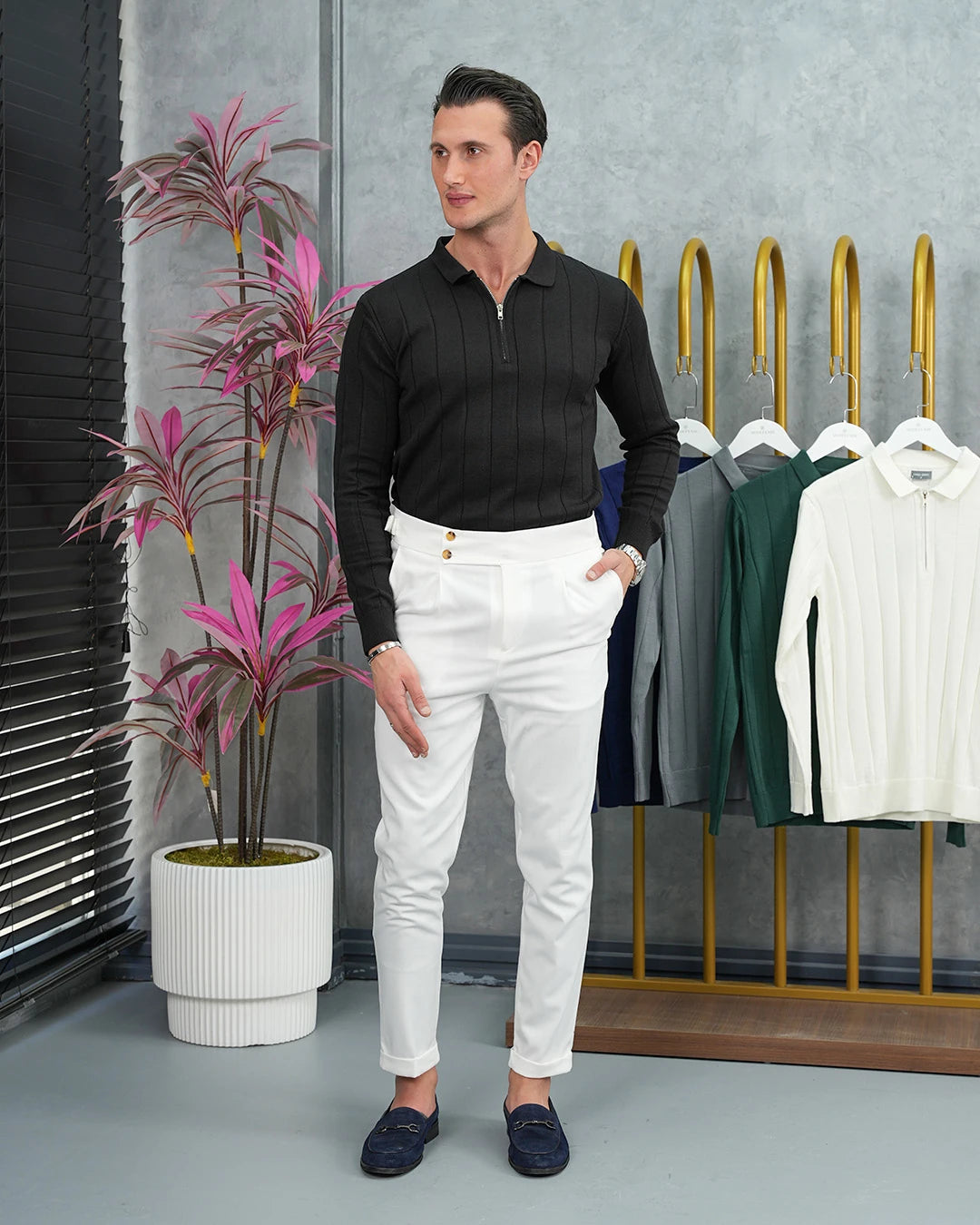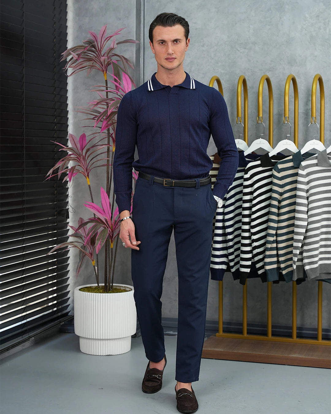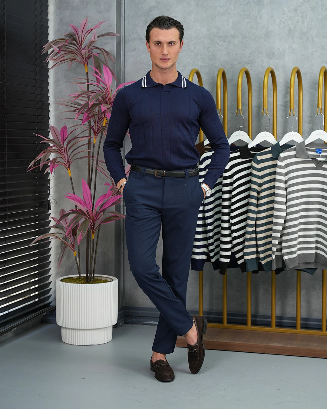 Pamuk Likra Slim Fit Örgü Desen Yaka Şerit Detaylı Polo Yaka Kazak