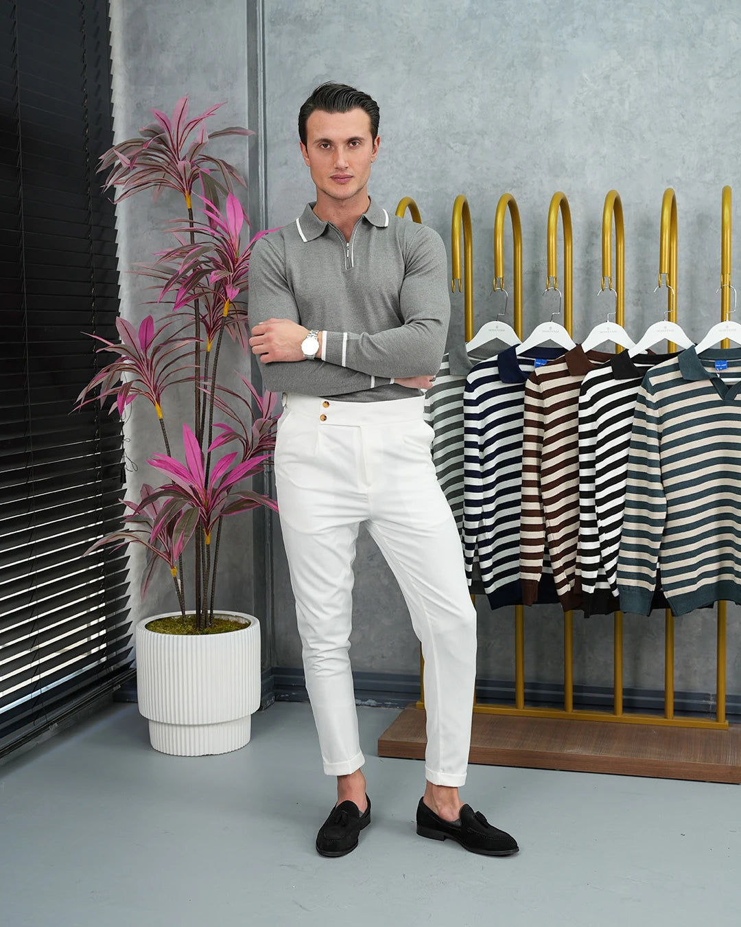 Pamuk Likra Slim Fit Örgü Yatay Desen Yaka Şerit Detaylı Polo Yaka Kazak