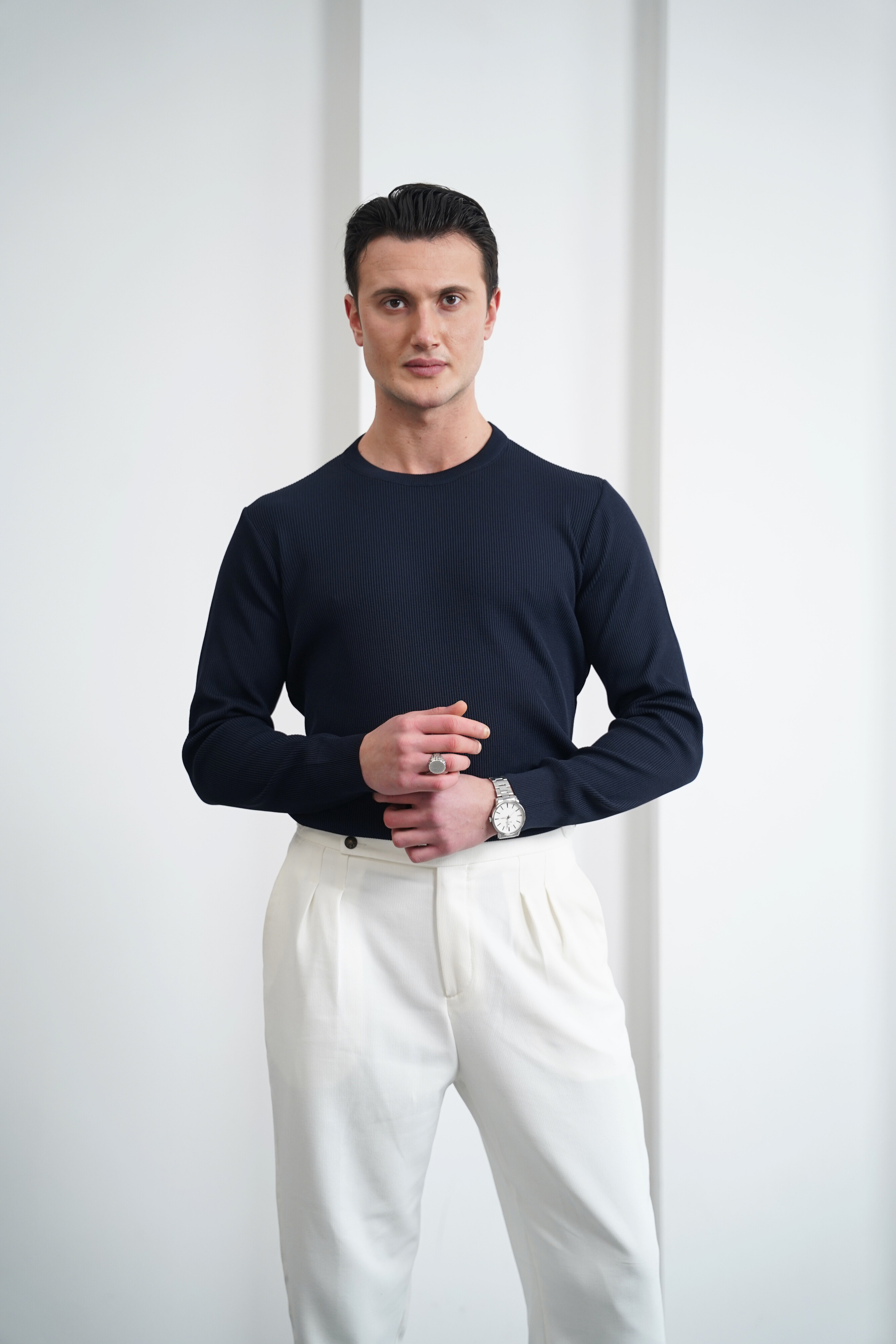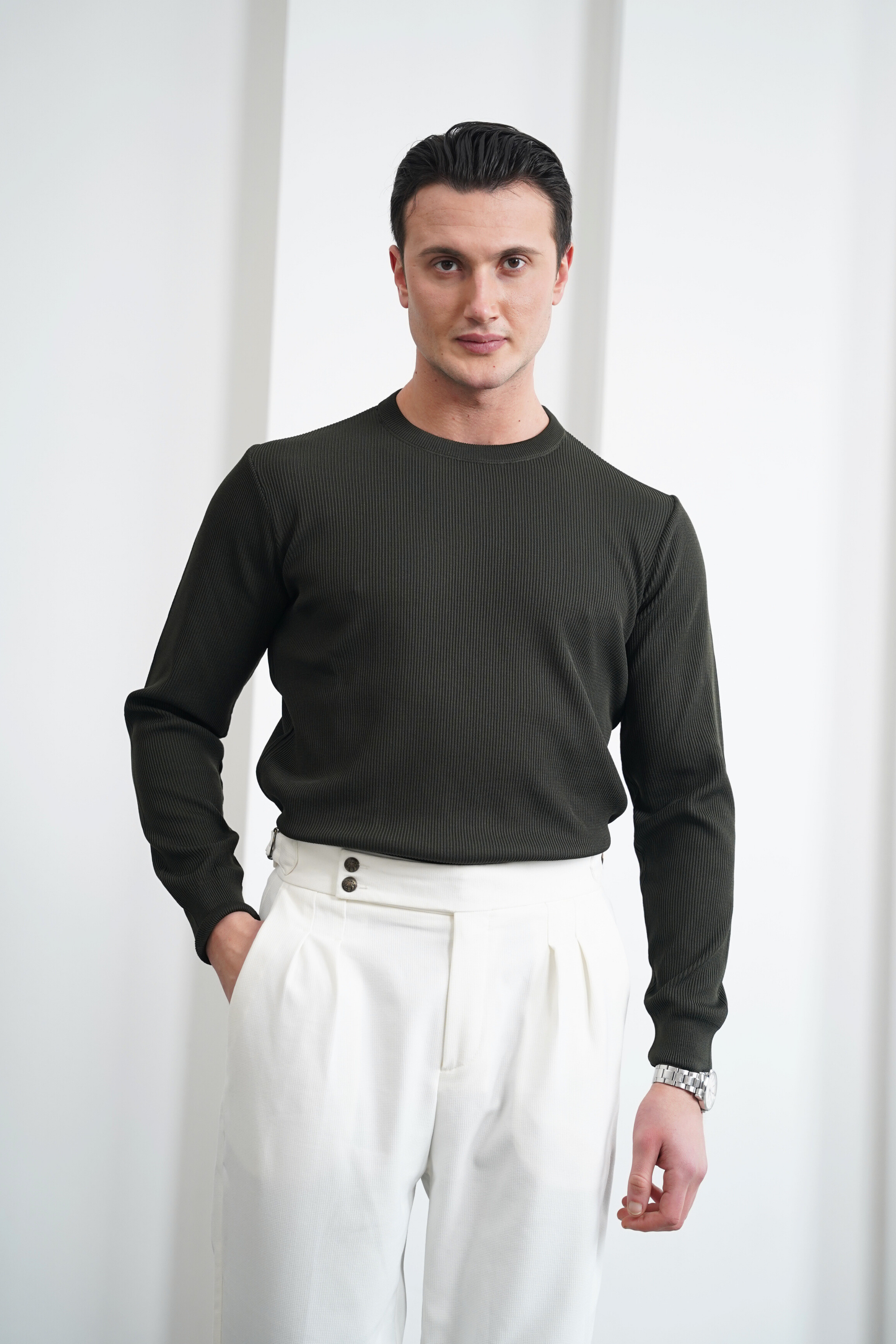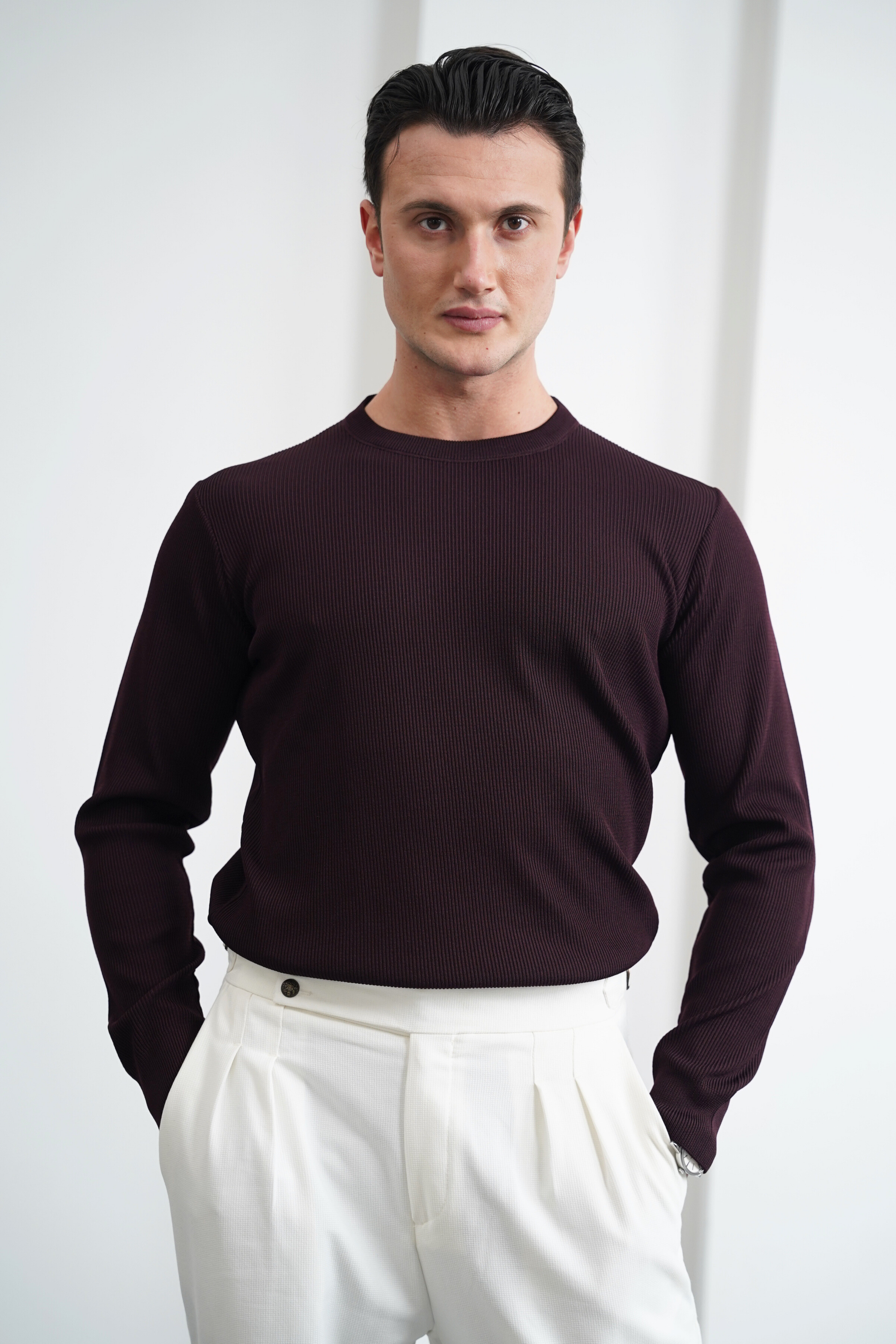 Pamuk Likra Slim Fit Kesik Yaka Dikey Çizgi Triko Kazak