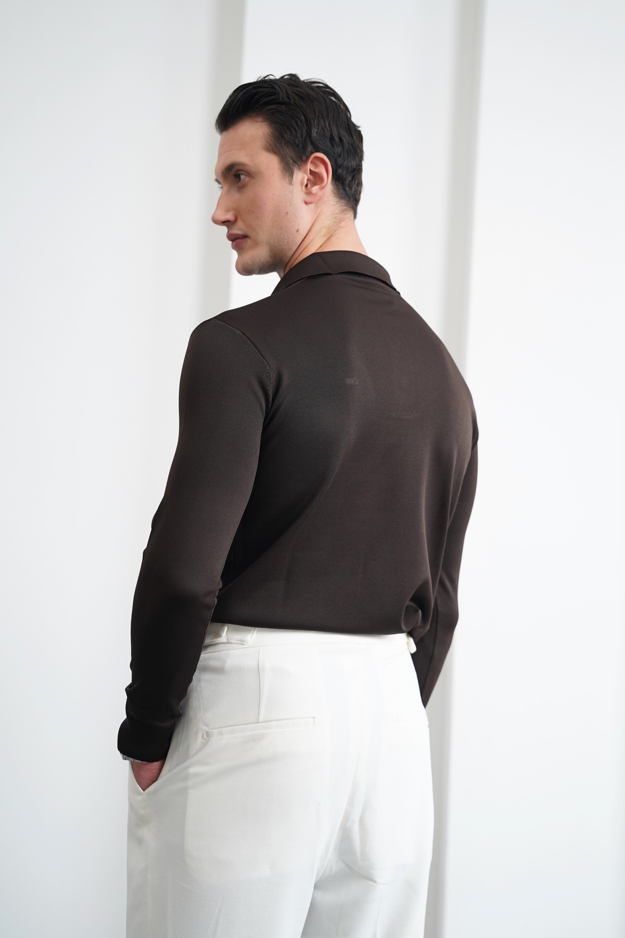 Pamuk Likra Slim Fit Örgü Desen Yaka Şerit Detaylı Polo Yaka Kazak